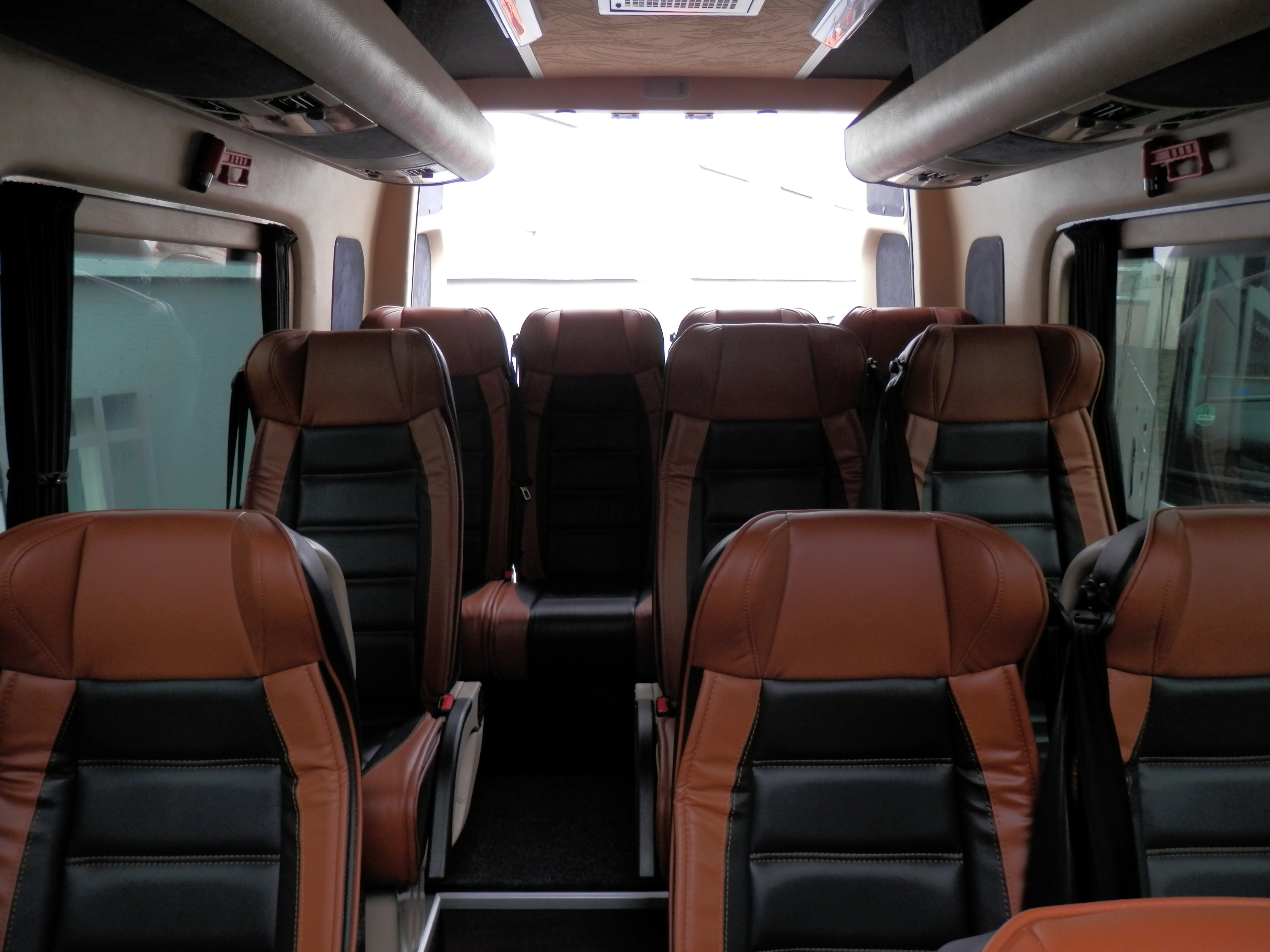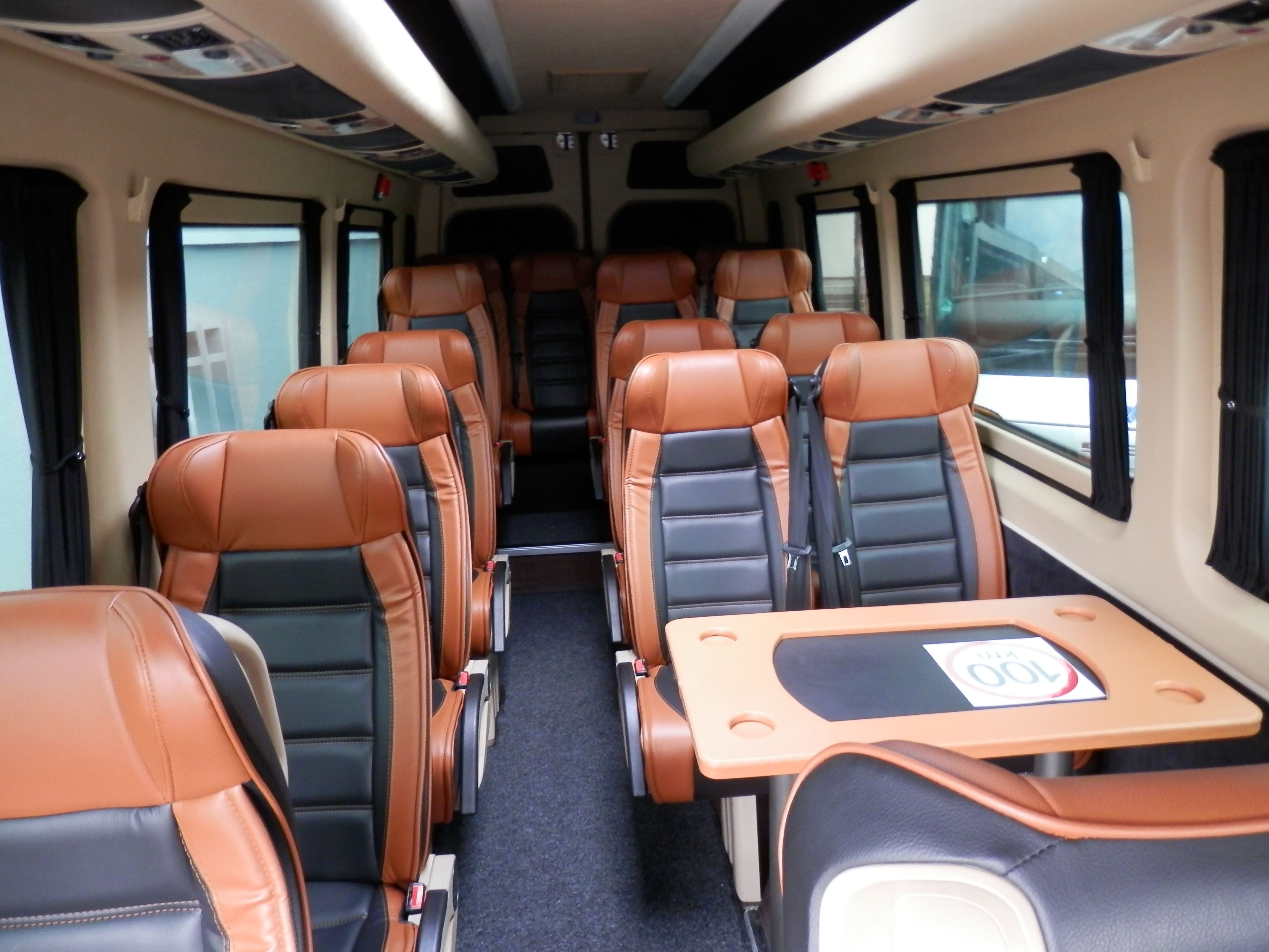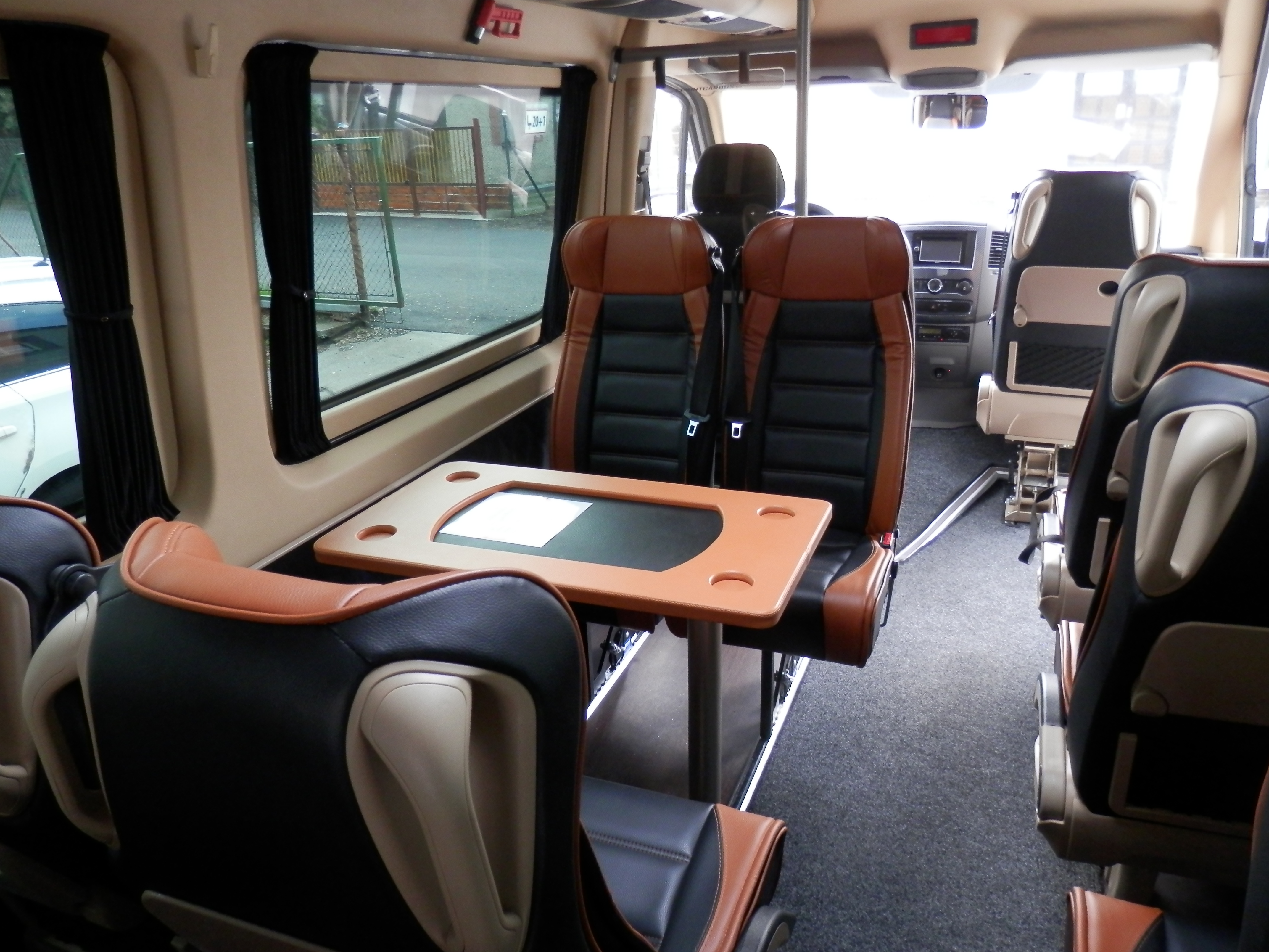 Vybavení našich vozů splňuje všechny požadavky pro pohodlné a bezpečné cestování. Sedadla jsou vypolstrovaná, čalouněná, anatomicky tvarovaná s polohovacím systémem a bezpečnostními pásy. Sedadla jsou také výsuvná do boku. Každé sedadlo má individuální osvětlení. Samozřejmostí je klimatizace, lednice, DVD přehravač, mikrofon a GPS.