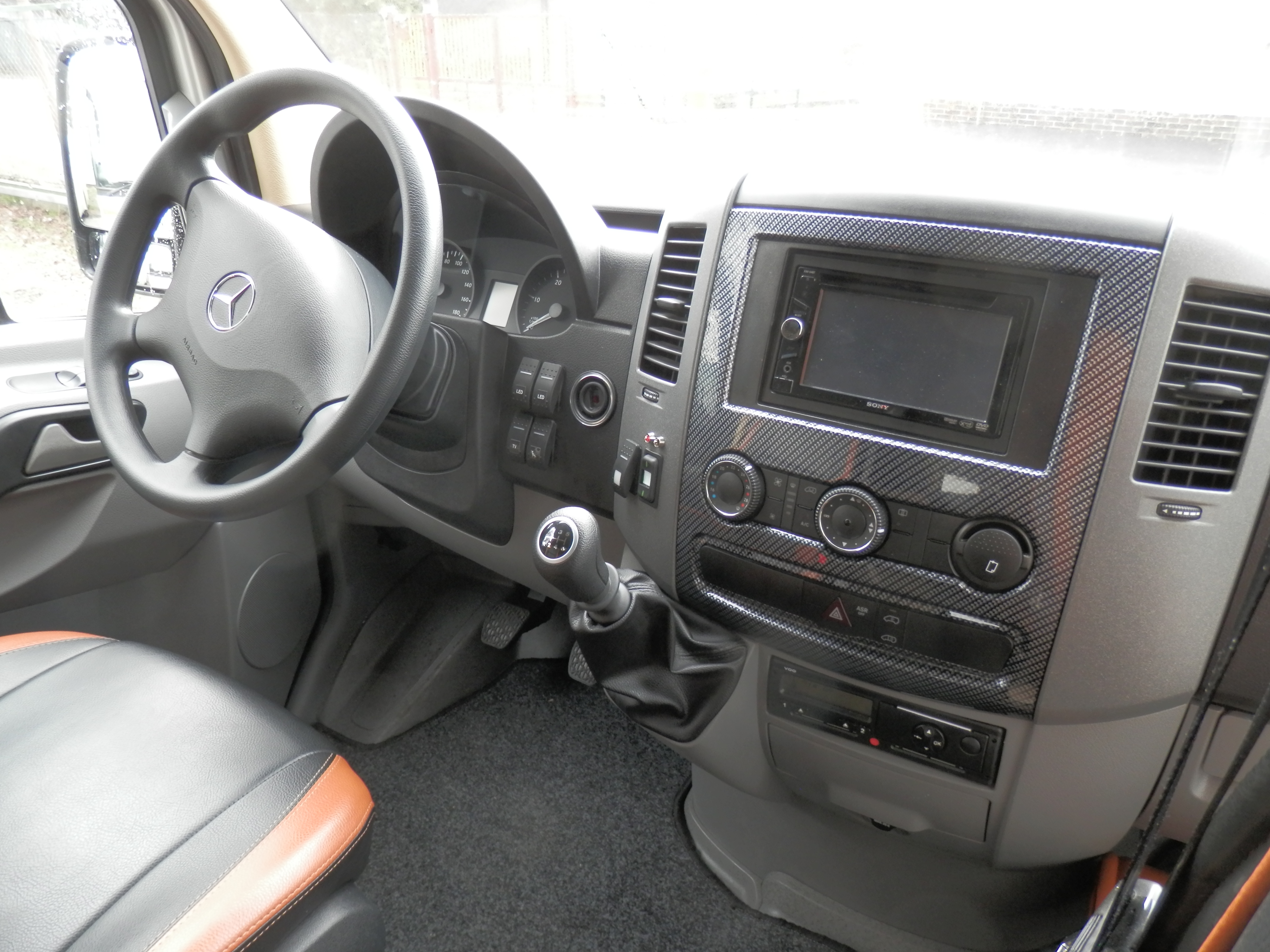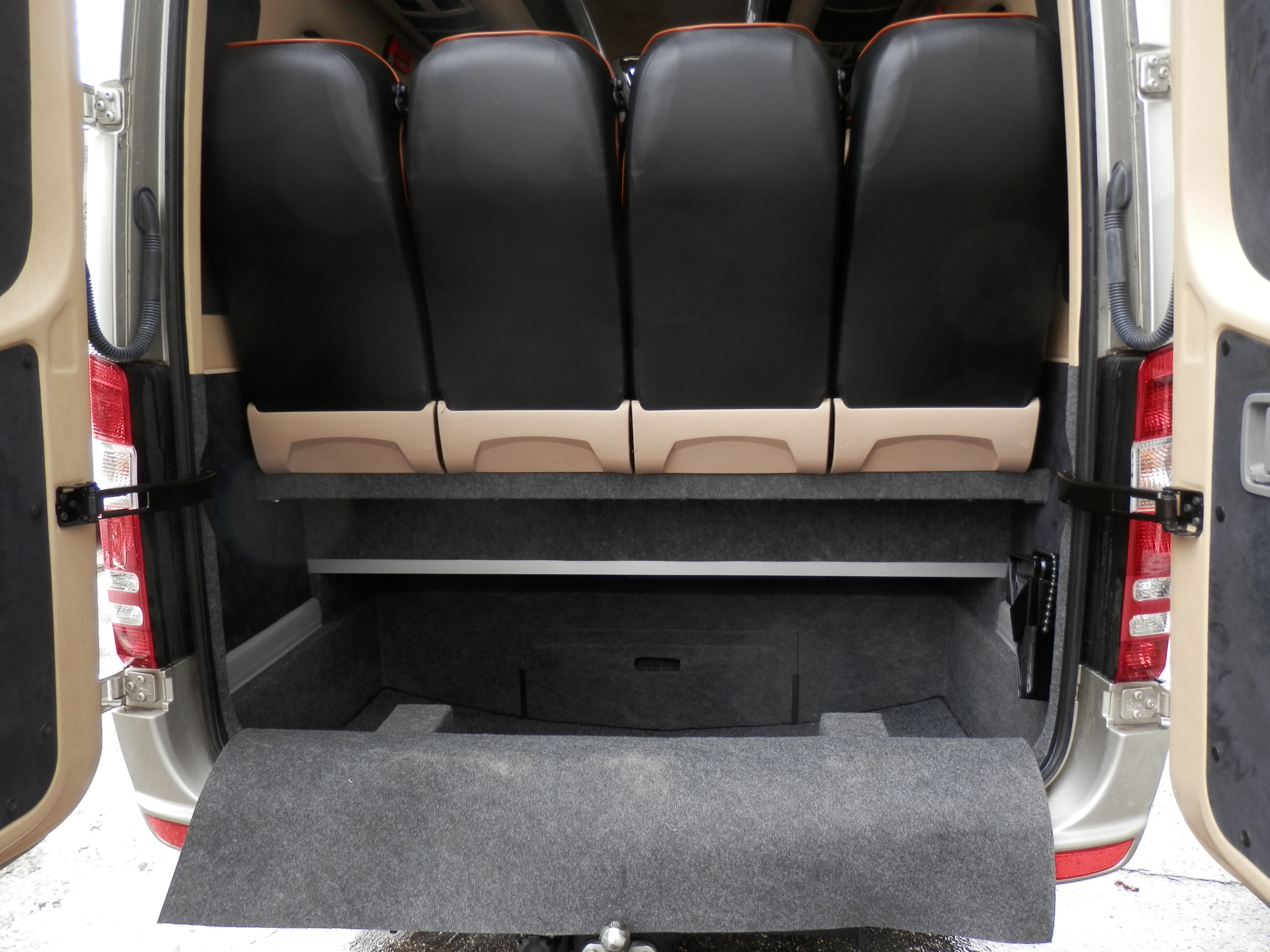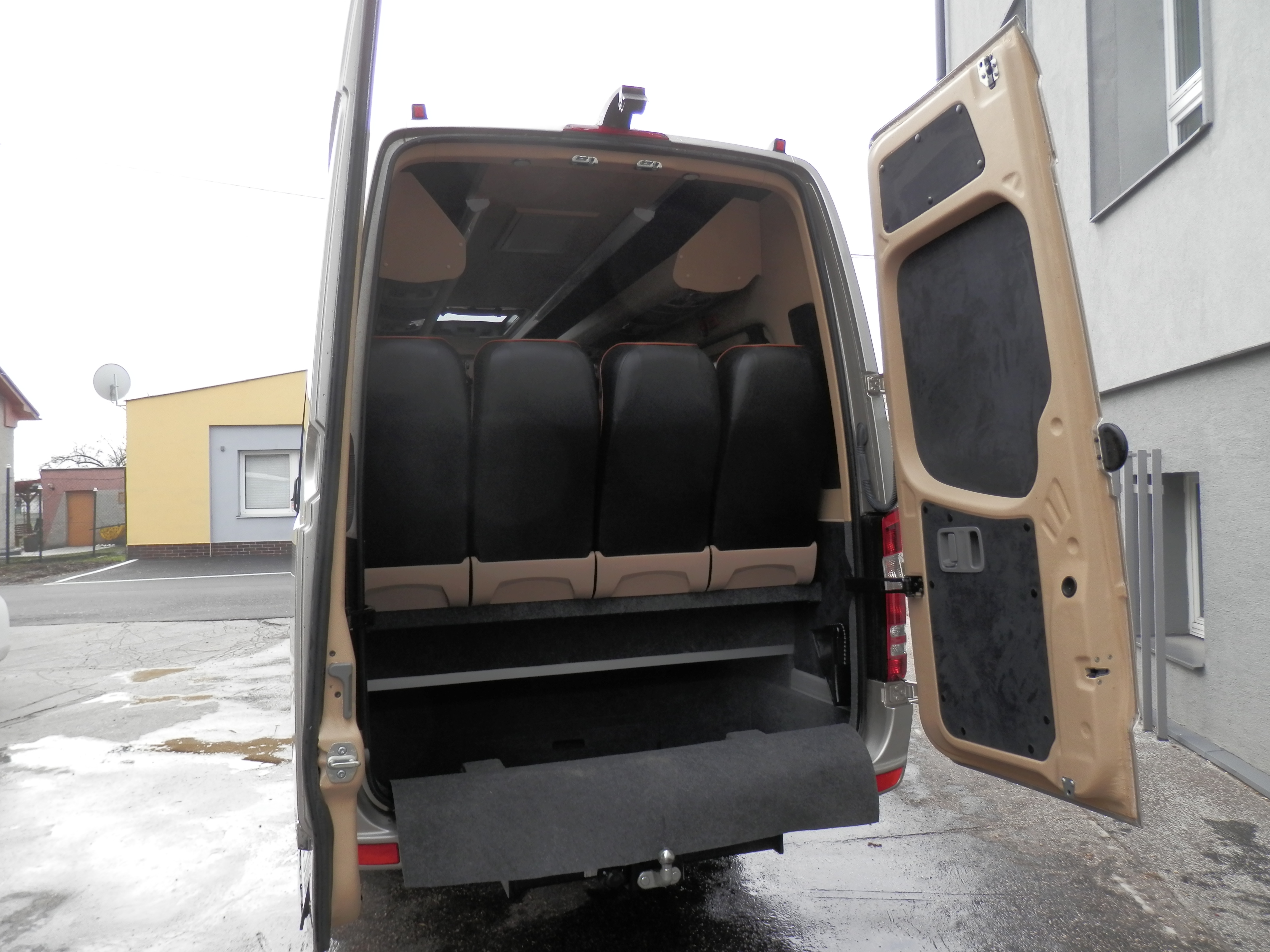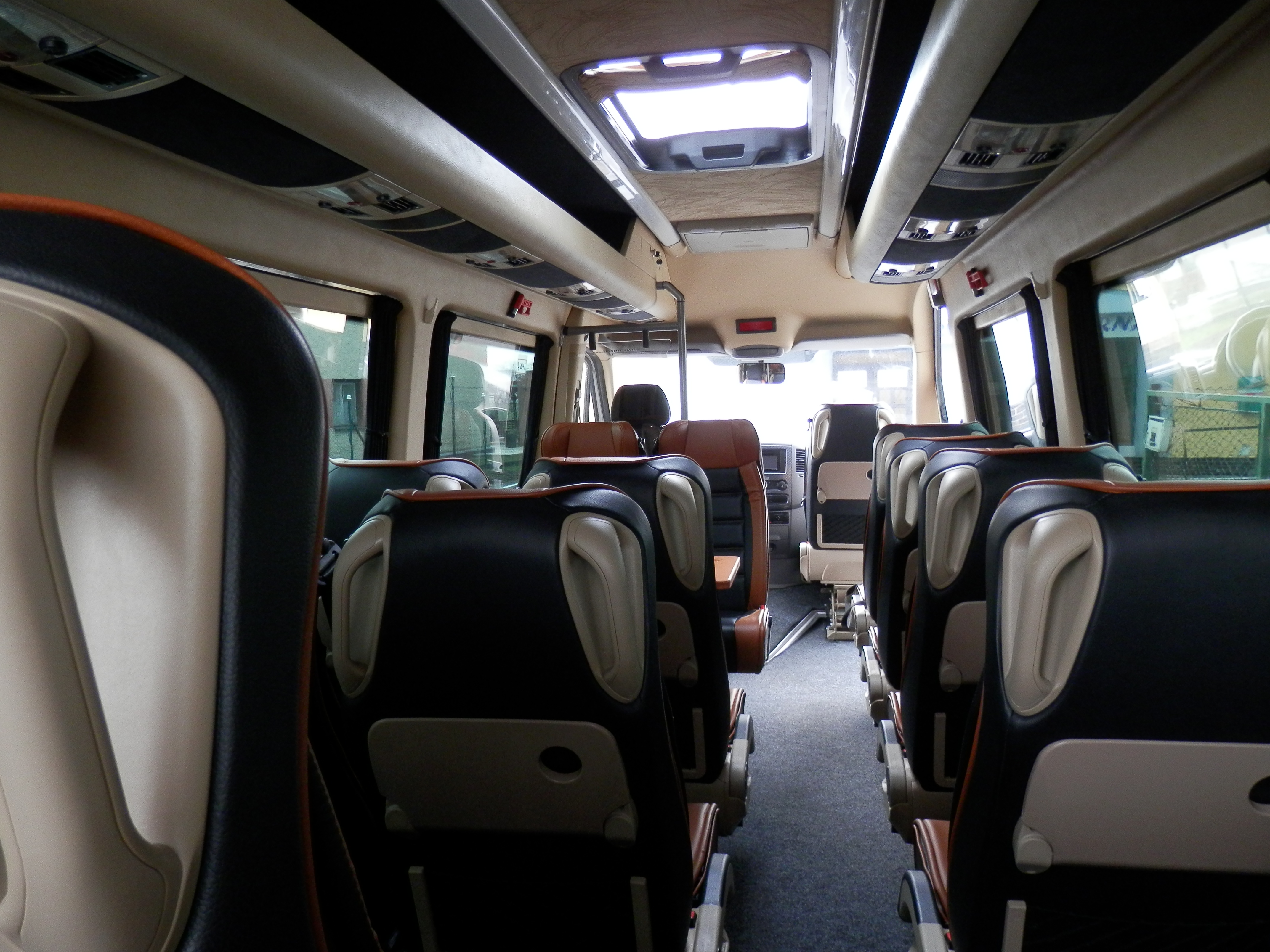 Vybavení našich vozů splňuje všechny požadavky pro pohodlné a bezpečné cestování. Sedadla jsou vypolstrovaná, čalouněná, anatomicky tvarovaná s polohovacím systémem a bezpečnostními pásy. Sedadla jsou také výsuvná do boku. Každé sedadlo má individuální osvětlení. Samozřejmostí je klimatizace, lednice, DVD přehravač, mikrofon a GPS.